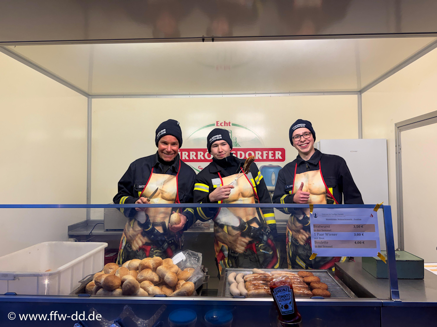 Bei winterlichen Temperaturen konnte man sich derweil in der Fahrzeughalle bei einem leckeren Glühwein oder Kinderpunsch aufwärmen. Gegen den Hunger wurden im Grillwagen Bratwürste und Buletten zubereitet.