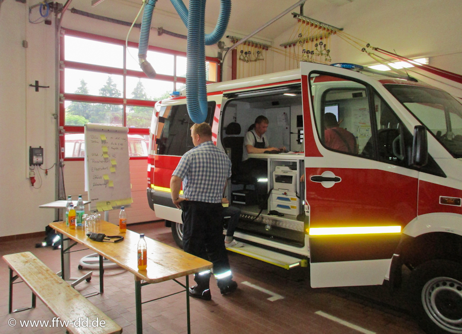 Da zu diesem Zeitpunkt bereits weitere Hilferufe bei der Leitstelle Dresden eingingen bekamen wir den Auftrag eine Einsatzleitung im Gerätehaus Dürrröhrsdorf-Dittersbach zu bilden. Mit Hilfe des neuen Einsatzleitwagens verschaffte man sich zunächst einen Überblick über die Lage und koordinierte dann die Einsatzkräfte entsprechend.